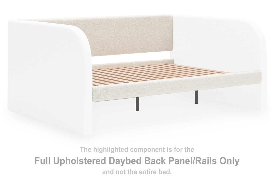 This full upholstered daybed back panel and rails set is made with engineered wood (MDF/particleboard/plywood) and polyester upholstery. Pairs with other items in the series to make a bed kit.