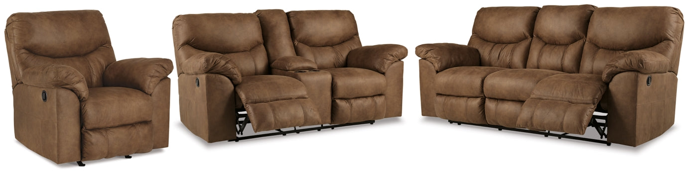 Rock the cool look of leather minus the hefty price tag with this reclining living room set. Rich with tonal variation, this set is covered in indulgently soft faux leather upholstery that looks like the real thing. And talk about over-the-top comfort. Double stuffed armrests and sumptuous cushions cradle and support in all the right places. Distinctive scooped stitching enhances this reclining set’s contemporary flair.