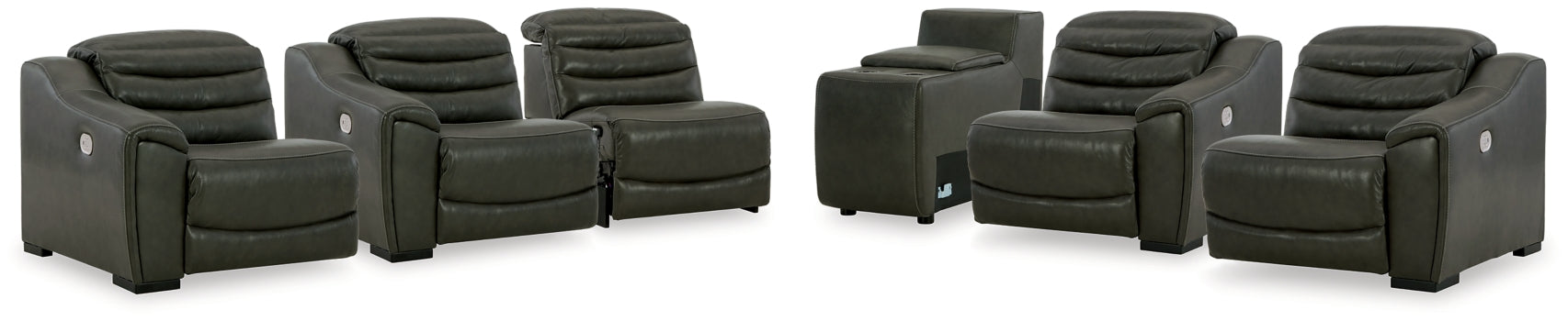 For those seeking to curate a living room retreat that offers superior comfort and a contemporary aesthetic, this sleekly designed power reclining sectional will become your favorite source of at-home serenity. Rest on leather match upholstery, and use the one-touch power control to recline and adjust the headrests with ease. As you recharge after a long day, your devices can too with USB charging. This sectional is visually enticing in a luxe dark gray, with slope track arms and stitched detailing on the back to enhance its modern appeal.