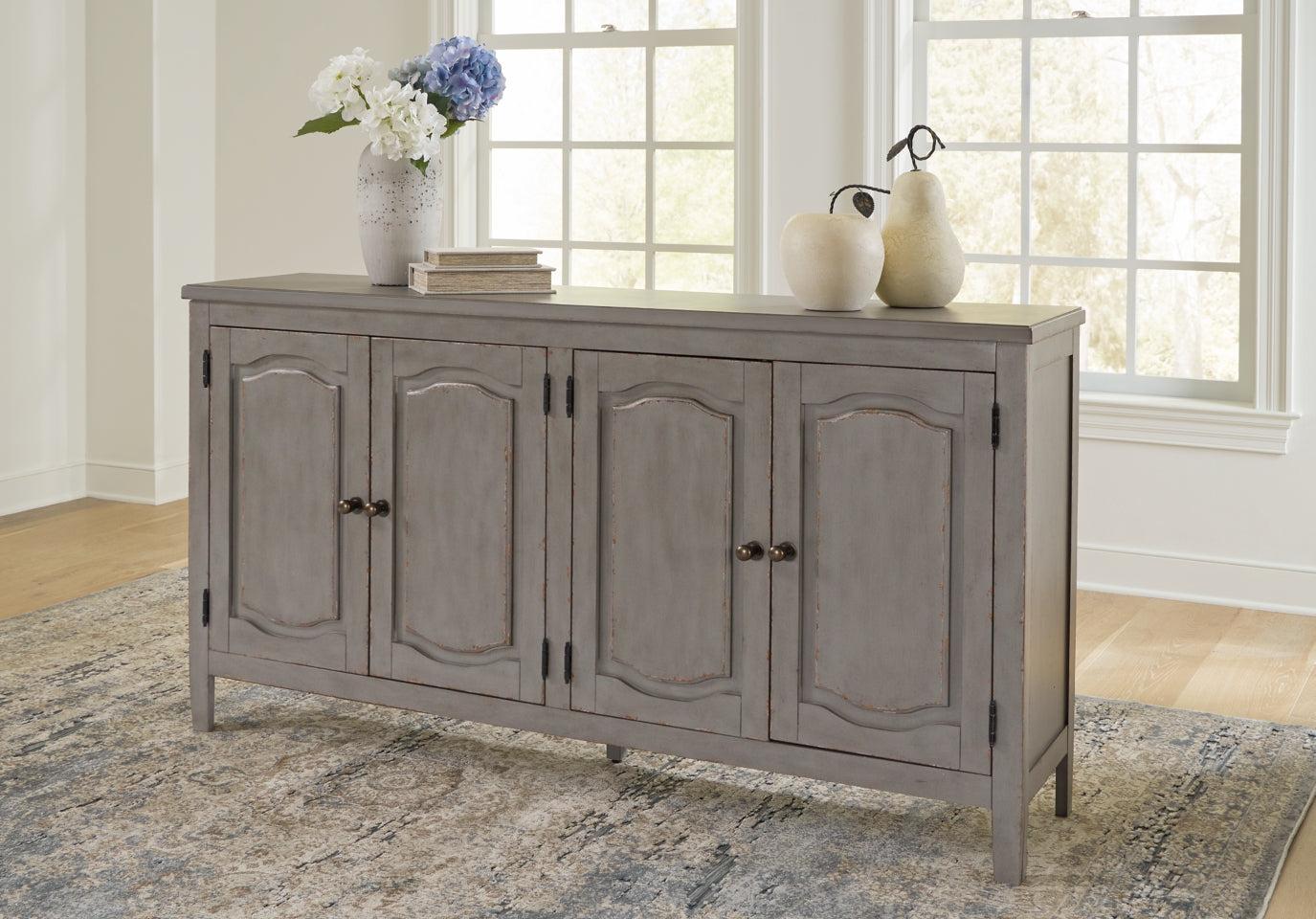 Put your love of European farmhouse styling on display. Finished with an antiqued gray chipped paint effect for an authentic vintage look, this accent cabinet is loaded with character. A pair of spacious double-door cabinets with an adjustable shelf provide plenty of storage for linens, dishes, glassware and more.