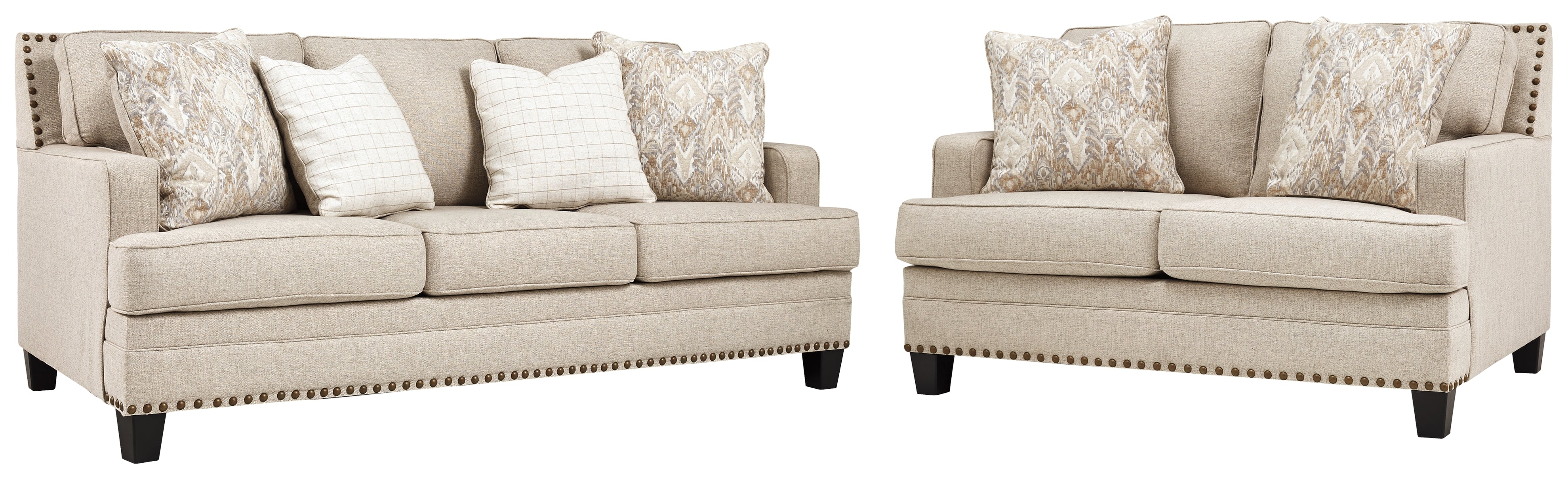 A case of contemporary and classic style influences coming together in a beautiful way, this sofa and loveseat set in beige brings a fresh perspective to modern farmhouse living. Distinctive elements include t-cushions that wrap around setback track arms, nailhead trim and a lovely linen-weave upholstery for an up-to-date feel. Muted hue designer throw pillows master the art of subtlety.