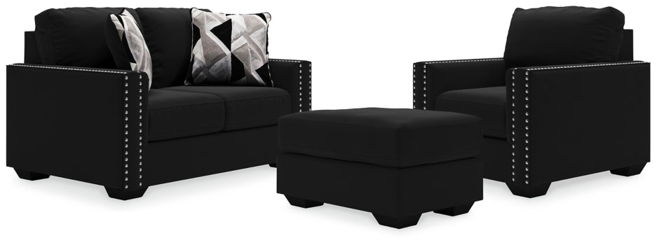 Raise your standard of living with this loveseat, chair, and ottoman package, designed for high-glam home decor. Dressed to impress, each piece features 2-over-2 cushion styling and sleek track arms punctuated with nailhead trim. The clean-lined profile is easy on the eyes and alluring to the touch with low-pile soft velvet that is hard to resist. Its posh appeal is enhanced by abstract patterned throw pillows.