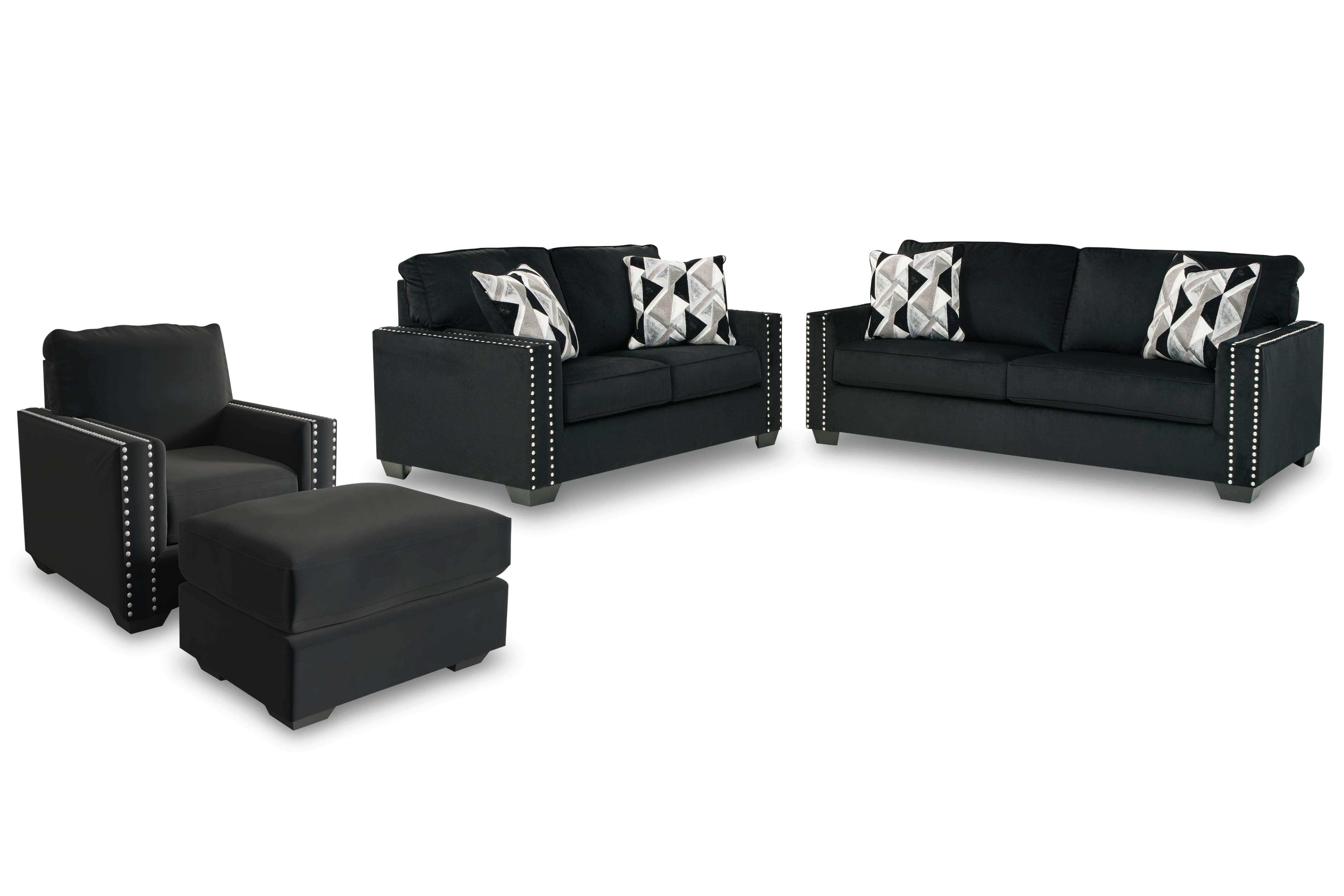 Raise your standard of living with this upholstery set in onyx black. Reserved exclusively for those with a penchant for high-glam home decor, this ultra-chic sofa is dressed to impress with a clean-lined profile, 2-over-2 cushion styling and sleek track arms punctuated with nailhead trim. Easy on the eyes and alluring to the touch, this decidedly contemporary set is covered in a low-pile soft velvet that's impossible to resist. Abstract-patterned throw pillows enhance the posh appeal.