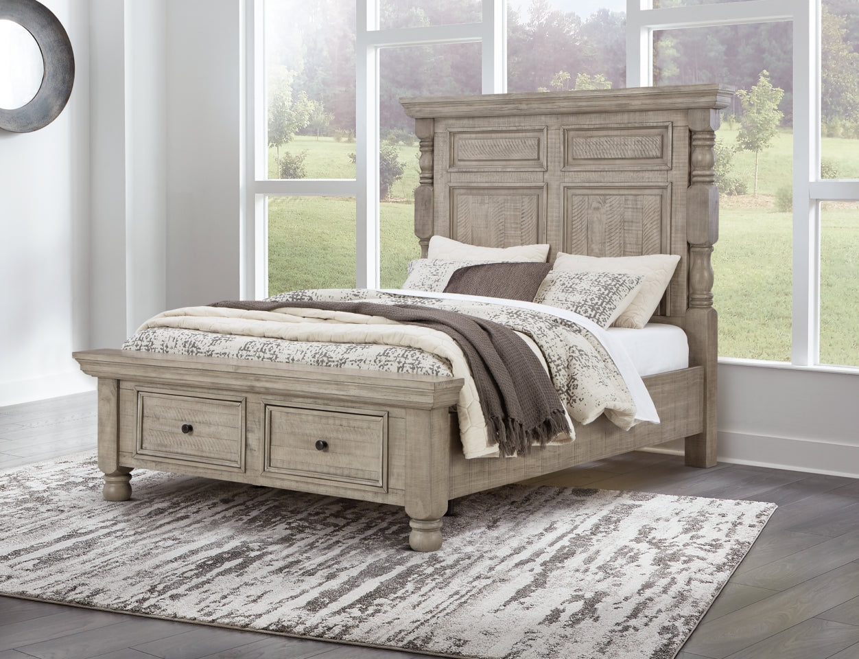 Embrace the feel of a mansion in the countryside when you revel in the romance of this queen panel bed. With its weathered light gray finish, substantial presence and thick mouldings, the piece has a sense of timeless beauty. Instantly the highlight of your home, this picturesque bed features turned posts that seamlessly connect to the main panels. The footboard’s two smooth-gliding storage drawers with aged iron-tone knobs are a stately finishing touch.