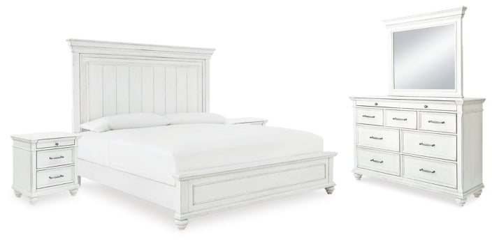 Give your retreat vintage charm with this queen panel bed. In a beautifully distressed whitewash finish, you'll love the headboard's grand style featuring a picture framed panel. Generously scaled moulding from top to bottom, along with bun feet give this bed character—evoking the feel of a quaint cottage escape. Dresser, mirror and 2 nightstands included.