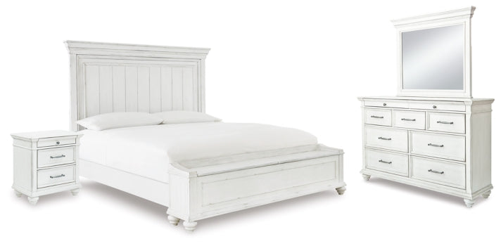 Give your retreat vintage charm with this queen panel bed and storage footboard. In a beautifully distressed whitewash finish, you'll love the headboard's grand style featuring a picture framed panel. The bench footboard is equally elegant offering extra storage and a convenient seat. Generously scaled moulding from top to bottom, along with bun feet give this bed character—evoking the feel of a quaint cottage escape. Dresser, mirror and nightstand also included.