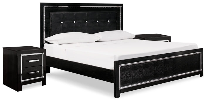 Rest easy. The luxurious look you’ve been dreaming of is yours for the taking—at a price sure to put you at ease. This panel bed brings a sense of old Hollywood with a contemporary flair. A deep, dark finish, faceted chrome-tone accents and LED lighting exude Hollywood-chic style to the max. Padded windowpane-stitching on the sleek, black upholstery infuses a sumptuous look that’s upscale and indulgent, and utterly on trend. A wireless remote allows you to control the color and brightness to suit the mood. 2 nightstands included.