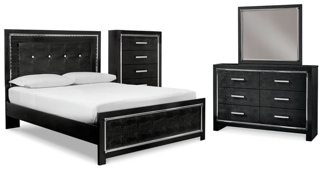 Rest easy. The luxurious look you’ve been dreaming of is yours for the taking—at a price sure to put you at ease. This panel bed brings a sense of old Hollywood with a contemporary flair. A deep, dark finish, faceted chrome-tone accents and LED lighting exude Hollywood-chic style to the max. Padded windowpane-stitching on the sleek, black upholstery infuses a sumptuous look that’s upscale and indulgent, and utterly on trend. A wireless remote allows you to control the color and brightness to suit the mood. Dresser, mirro and chest included.
