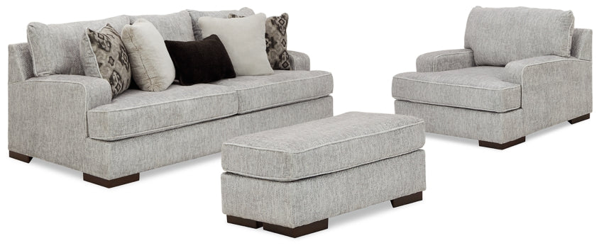 An indulgent choice with deep seats crafted for ultra-plush softness, this designer sofa is the ideal merger of modern flair and classic staying power. If you love a touch of texture, you’re sure to appreciate this sofa’s gorgeous gray upholstery with subtle chevron effect. Posh toss pillows layered over the loose back cushions perfect the richly relaxed aesthetic. Matching oversized chair and ottoman included.
