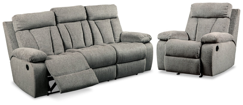 Your to-do list is complete, now it's time for ultimate relaxation. This double reclining sofa and recliner is plush in all the right places, and will support you for longer than you can binge watch your favorite TV show. The neutral upholstery is ready for patterned throw pillows and some of your time. The sofa's middle seat back drops down into a convenient table top with cup holders, the perfect resting spot for tablets and magazines.