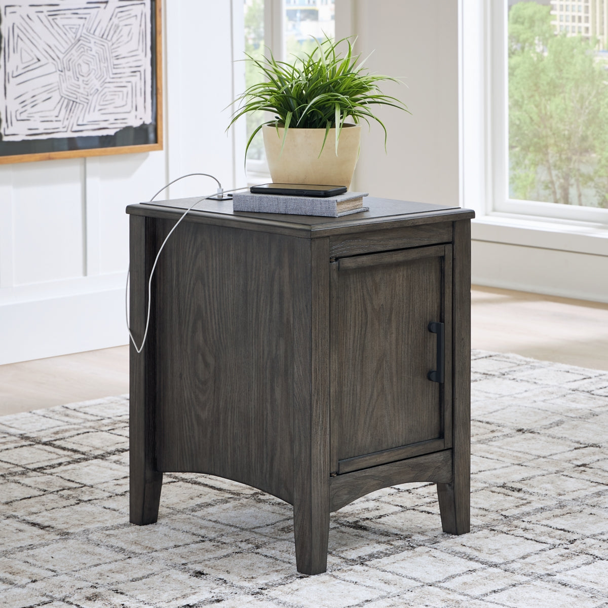 Cool and clean, yet warm and inviting. This chairside end table has so many standout qualities, making it an inspired choice for your dream decor. A prime example of “casual contemporary” style at its very best, the designer piece is dressed to impress with an embossed wood grain texture. Its cabinet conceals a shelf ideal for storing smaller items like your e-reader, TV remotes and other seat-side must-haves. With convenient USB charging ports, devices can be charged without having to get up. And the medium gray-brown finish with a blackened wood grain contrast is wonderfully easy on the eyes.