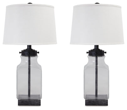 New turn on an old classic. This delightfully styled table lamp set is brimming with vintage-inspired charm. Elements include antiqued silvertone metal paired with a smoky glass base and a modified drum shade for a crisp, clean touch.