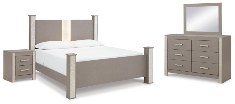 Love sleek and bold contemporary style? Drink in the beauty of this queen poster bed. The piece's eye-catching details include a leather grain look, glam glitter accents and remote-controlled LED lighting. Combined with the streamlined aesthetic, it's a simply stunning way to achieve the bedroom of your dreams. Dresser, mirror and nightstand included.