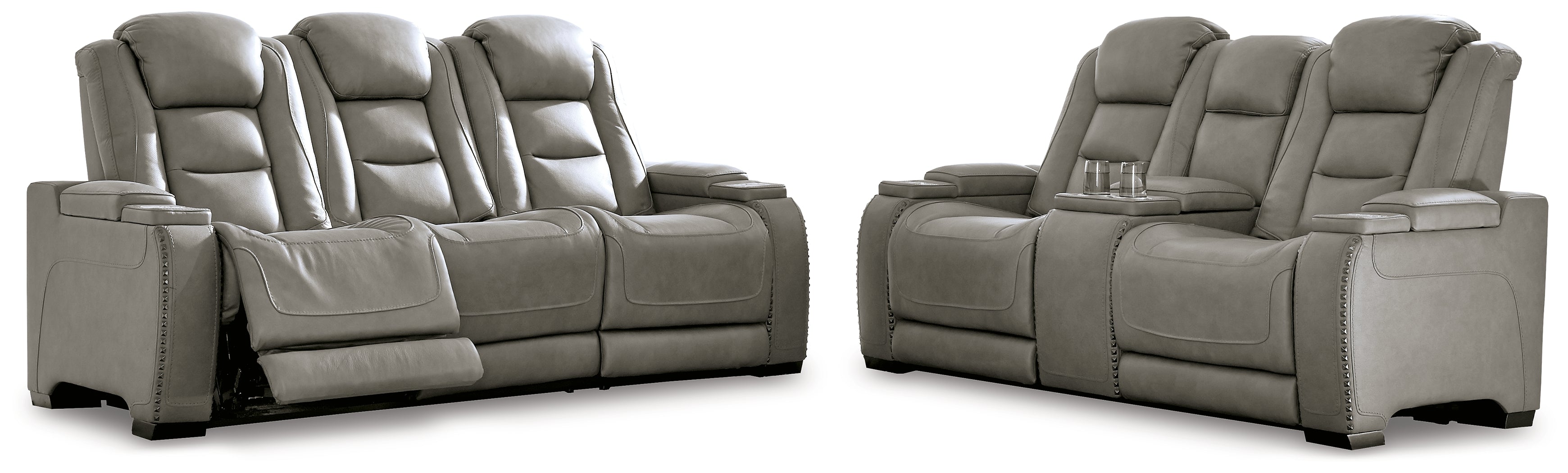 Reserved for him and made for her, this power reclining sofa and loveseat set in gray delivers all the comfort and style you could ask for. Inspired by sports car interiors, the seating area is covered in real leather for your pleasure, with a "perforated automotive" treatment for that much more appeal. Positioned at your fingertips, the advanced one-touch power control puts you in the driver’s seat with everything from an Easy View™ power headrest and power lumbar support, to a USB port and wireless charging for your phone. Talk about fully loaded. And with integrated cup holders and hidden storage compartments under the posh, padded armrests, this designer power reclining package makes the most of every inch of space.
