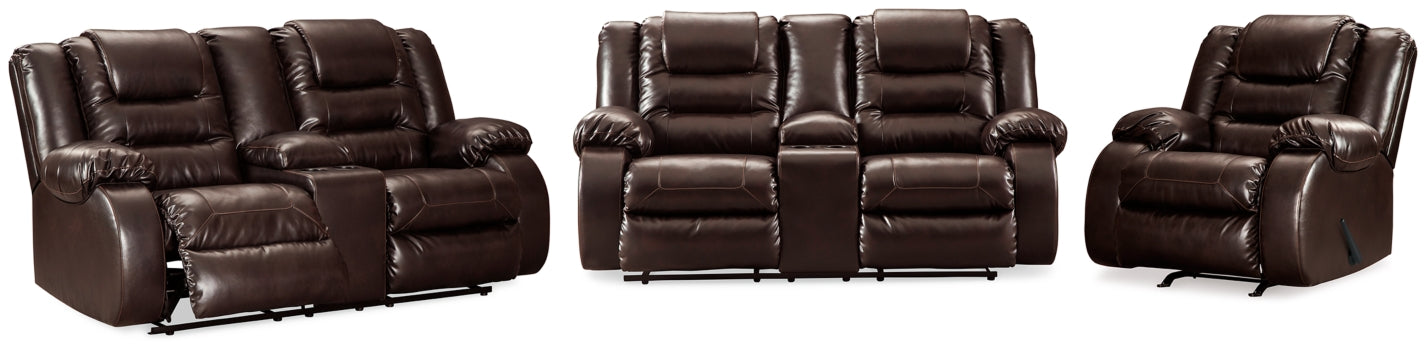 When it comes to comfort, style and value, this faux leather reclining loveseat in chocolate brown rocks. Tailored for feel-good flair, its fashion-forward bustle back design is enhanced with sculpted padding on the headrest for cradling support. Channel cushioning along the sides flows into thick, wrapped pillow top armrests that are truly over the top. And while it might look like you broke the bank, a sumptuously soft leather-like fabric keeps indulgence well within budget. Matching recliner included.