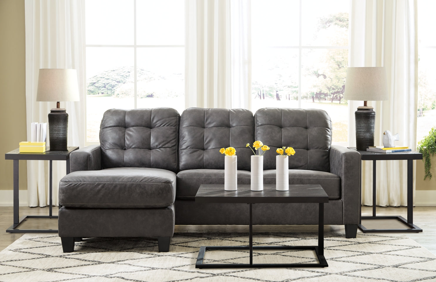 This ultra-contemporary sofa chaise, 3-piece occasional tables, and pair of lamps set invites you to kick out and make yourself comfortable. Linear track arms offer a clean, sleek aesthetic, while tufted box cushions are a nod to mid-century design. Gunmetal gray faux leather offers the cool, weathered look you love and touchably soft feel you crave.