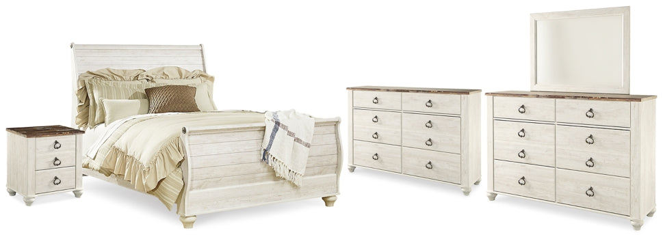 The ultimate look for a beach cottage or shabby chic inspired retreat, this queen sleigh bed carries you away to a dreamy time and place. Its driftwoody whitewash finish is wonderfully easy on the eyes. Faux plank detailing incorporates a classically rustic touch that's so homey and comforting. Set also includes a dresser, mirror and chest.