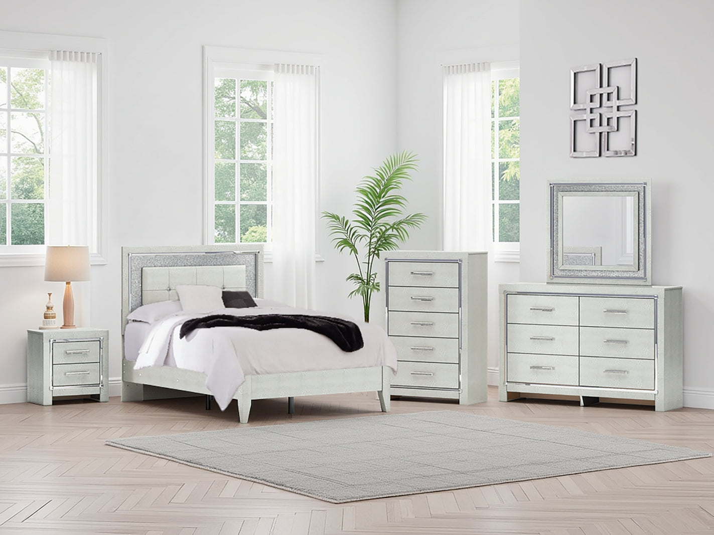 Bright, bold luxury. This full upholstered bed dazzles with its attention to detail. Your love of glamorous style is reflected in the tufted upholstery with faux alligator effect, exquisitely paired with faceted chrome-tone and glittery details. Complete with LED lighting around the headboard, it inspires you to live luxuriously every day—from waking up to reading before bed.