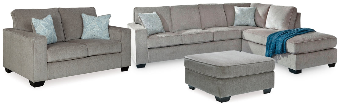 If style is the question, then this sleeper sectional is the answer. Sporting clean lines and sleek track arms, the decidedly contemporary profile is enhanced with plump cushioning and a chenille-feel upholstery, so pleasing to the touch. Sure to play well with so many color schemes, this sleeper sectional in richly neutral alloy includes a pair of understated floral pattern pillows for fashionably fresh appeal. Crafted of quality memory foam, the pull-out full mattress comfortably accommodates overnight guests. Matching loveseat and ottoman included.