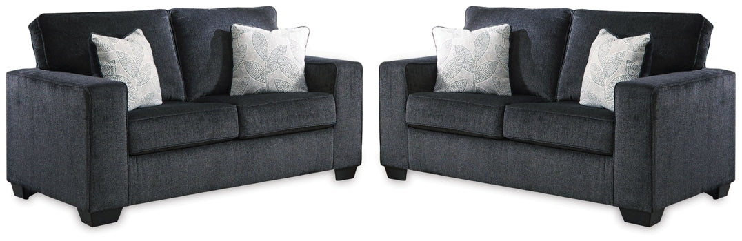 If style is the question, then this pair of matching loveseats is the answer. Sporting clean lines and sleek track arms, the decidedly contemporary profile is enhanced with plump cushioning and a chenille-feel upholstery that's so pleasing to the touch. Sure to play well with so many color schemes, this loveseat in slate gray includes a pair of understated floral pattern pillows for fashionably fresh appeal.