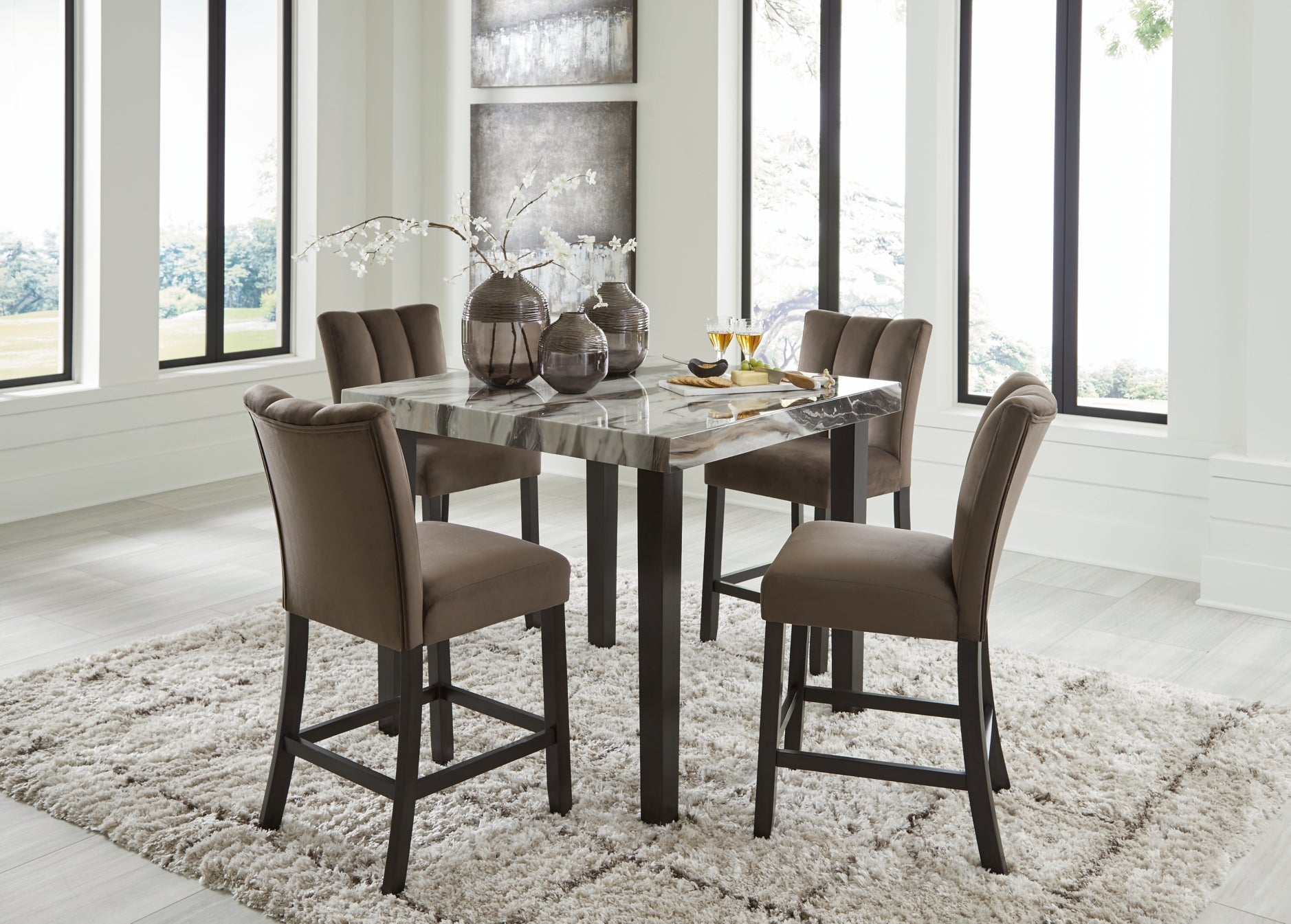 This dining package reflects your highly contemporary point of view. Its faux marble tabletop is a feast for the senses—white contrasts with the light and dark brown veining to create an elevated, authentic feel. The seats, with ultra-soft velvet upholstery in chocolate brown, are a feast for the senses. What a delicious choice for an elegantly elevated dining room.