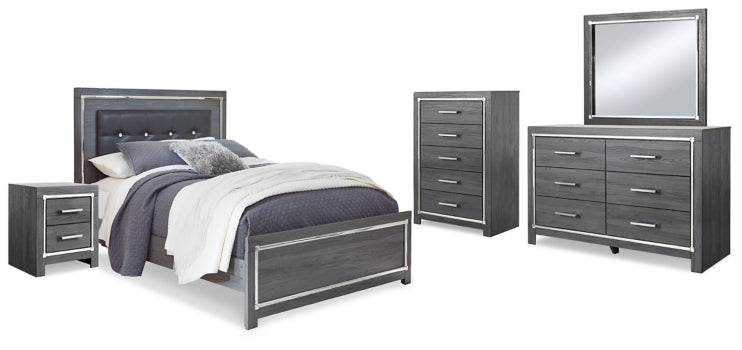 Reminiscent of Hollywood glamour of yesteryear, this queen panel bed interprets luxury in a decidedly modern way. Sumptuous details include button-tufted upholstery, faceted faux crystals and chrome-tone accents beautifully lit by LED lights enhanced with remote-controlled settings for color and brightness. Dresser, mirror, chest and nightsand also included.